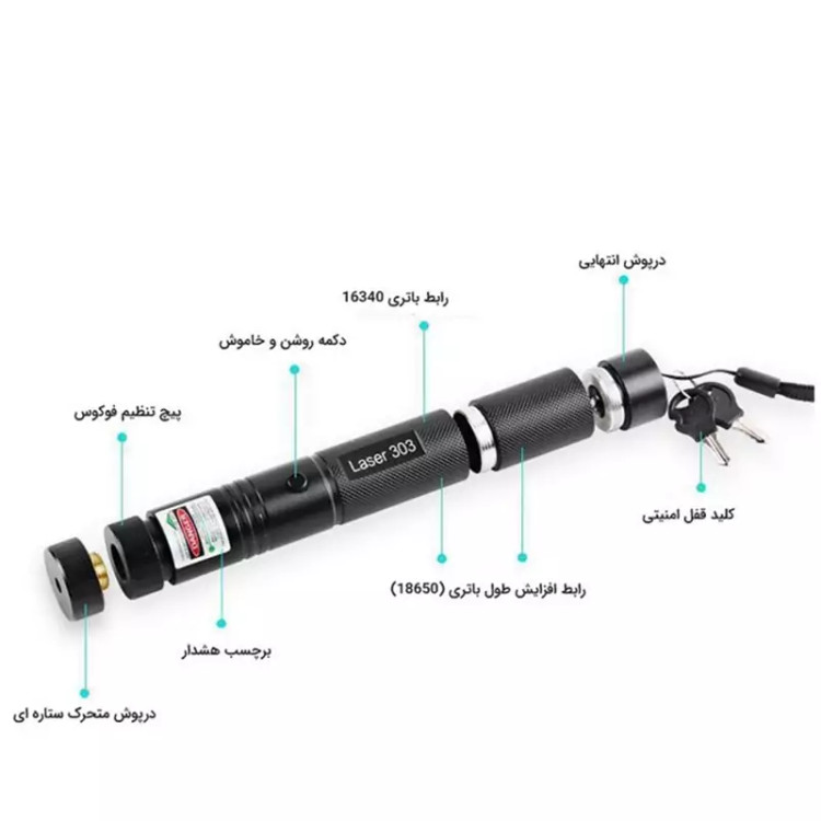 البته نور ساطع شده از یک سر ان که به سری سوزنی معروف است قادر به متمرکز نمودن و ساطع نمودن لیزر سبز تا ۷ کیلومتر میباشد و سرهای دیگر مخصوص پراکنده نمودن این پرتو نور میباشند.