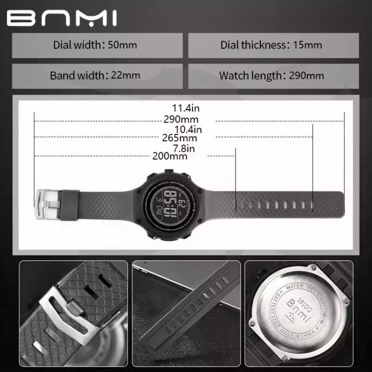 ساعت مچی دیجیتالی بنمی مطابق با هر سبک و سلیقه ای رنگ متفاوتی را معرفی کرده است. ساعتbnmi 1810G با قطر صفحه 50 میلی متری که سایزی بزرگ است، برای آقایان که مچ نسبتا بزرگ تری در قیاس با دست بانوان دارند مناسب تر است. البته این ساعت مدل های زنانه نیز دارد که قطر صفحه ساعت کوچک تر میباشد که در فروشگاه ما با سرچ کلمه bnmi مدل زنانه آنرا نیز میتوانید ببینید و به سبد خرید خود اضافی کنید.